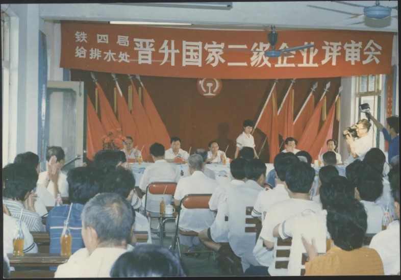 企业升级是国家“七五”期间的中心任务,围绕着“抓管理、上等级、全面提高素质”的工作要求,全处广泛宣传发动。从加强基础工作入手,成立领导小组和企管办,围绕安全、质量、效益等重点,广泛开展标准化、计量、能耗、档案、普法、全面质量管理、班组建设等专项达标升级。机关各部门、各单位对照“方针目标任务展开表(类似于现在管理矩阵、责任清单)开展资料“补强”工作。1990年,给排水工程处通过铁道部评审组考核验收,成为全局第一家晋升国家二级企业的单位,全处职工每人都晋升了一级标准工资,更重要的是刚刚成为独立法人不久的给排水处整体管理理念和综合素质有了显著提升。处相继荣获全国五一劳动奖状、全国先进施工企业等荣誉,成为名噪一时的铁四局“四小龙”之一,无论是企业管理、经济效益还是员工风貌,都成为全局标杆。