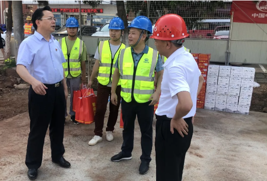 8月12日,荆门市委副书记、市长孙兵一行到公司承建的荆门金龙泉大道改造工程检查指导工作并慰问一线职工,为他们送去关怀和防暑降温物品。荆门市副市长陈实、市政府秘书长何平等陪同。