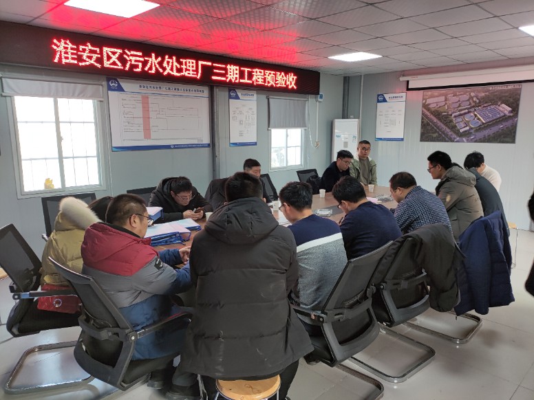 1月20日,淮安区质监站、淮安首创生态环境有限公司、中设设计乐竞官方版网站登录入口股份有限公司及淮安市正中工程建设监理有限公司等单位共同对淮安区黑臭水体综合整治PPP项目污水处理厂三期工程进行预验收。