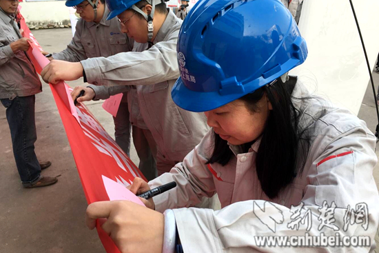 职工在承诺横幅上签名。