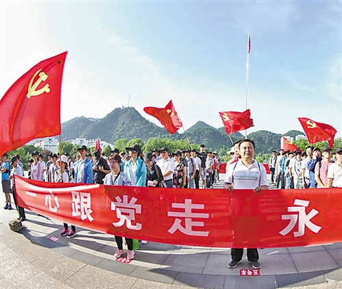6月27日,安徽省歙县举办“一心跟党走 永远在路上”活动迎接党的生日。当日,200名县直机关党员和非公企业的党员从县城出发,沿着革命先烈走过的足迹,到达溪头镇汪满田村红军纪念碑。活动中举办升国旗、唱国歌仪式,沿途宣传环保、扶贫、文明创建等内容。吴建平摄